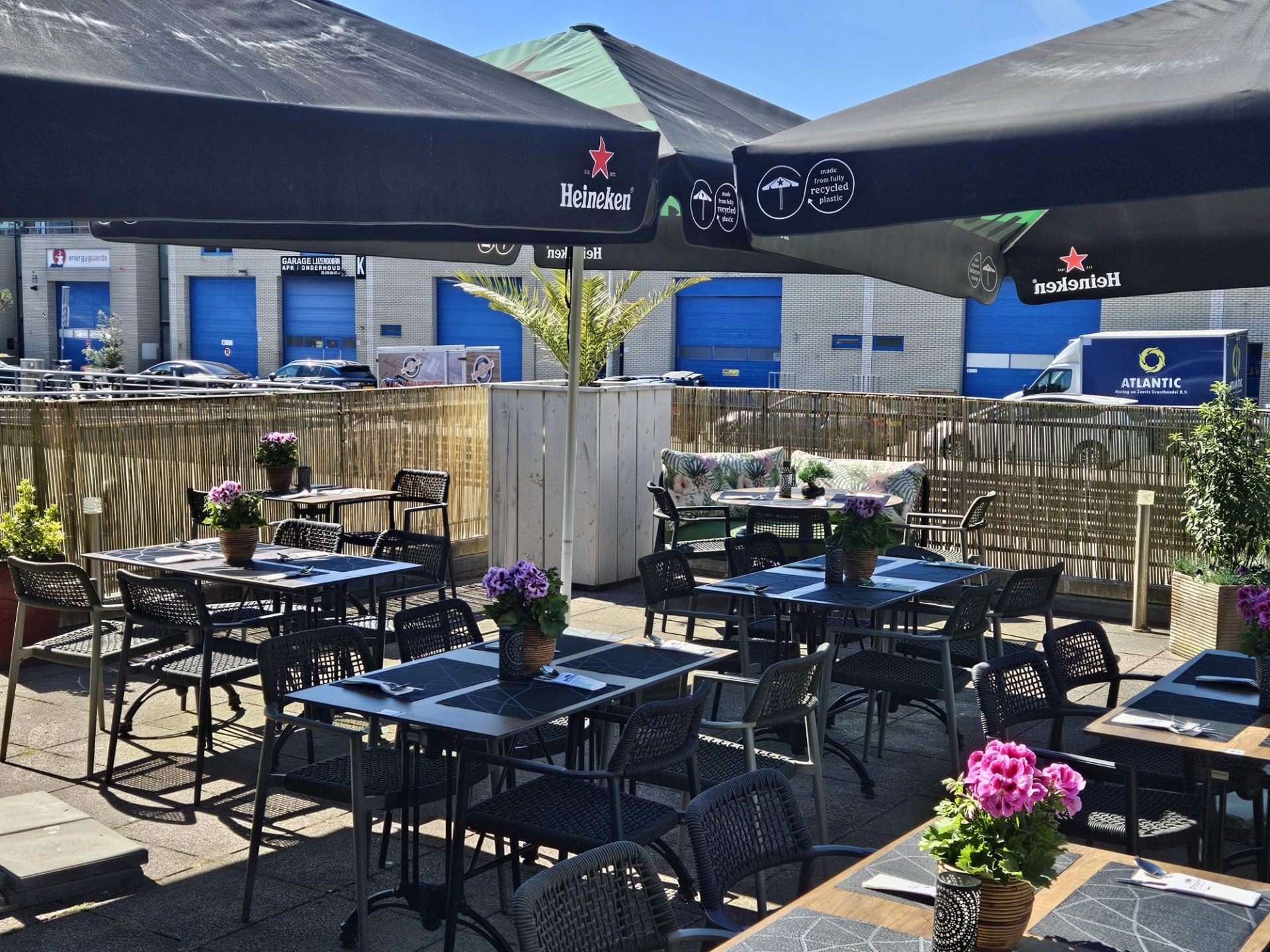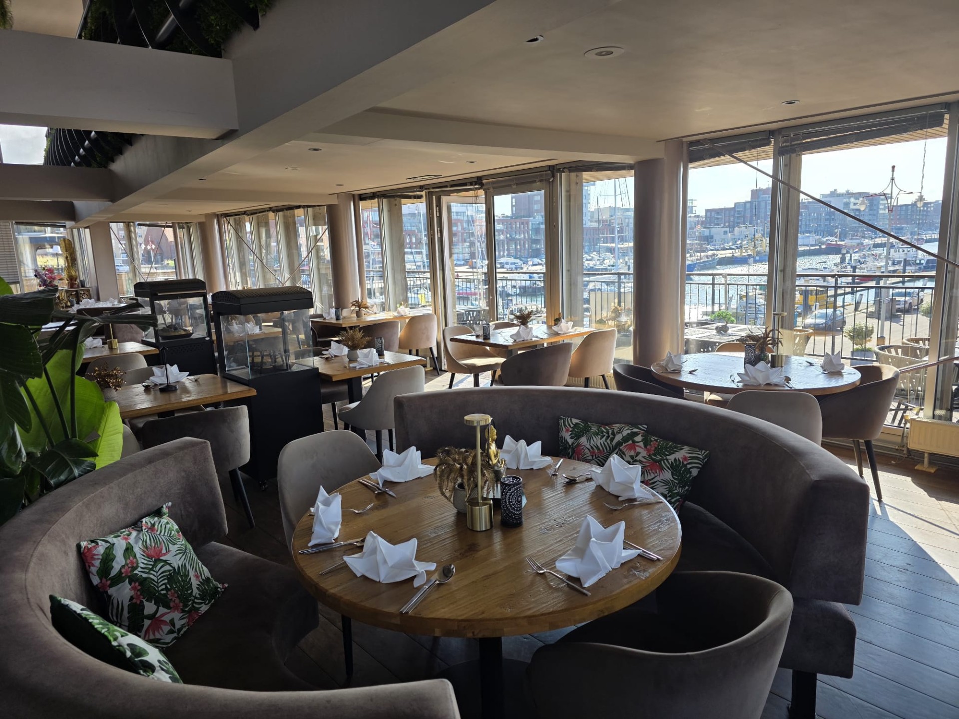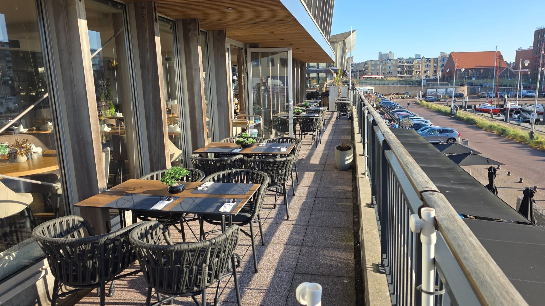 Verder kent het bedrijf 3 sfeervolle terrassen met in totaal 160 stoelen rondom het pand met prachtig uitzicht over de historische 2e binnenhaven en waar in de zomer de gehele dag zon is.